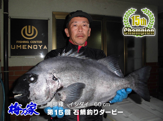 2018年7月1日から12月31日まで開催されていた第15回梅乃家石鯛釣りダービーにおいて12月26日に、60cmの見事な石鯛を釣り上げた対馬市の阿部さんが見事栄冠に輝きました! 優勝した阿部さんには賞品として「次回ダービー期間内無料乗船券」が進呈されました! 優勝おめでとうございます! |