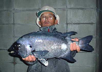 | 平成17年7月1日〜12月31日まで開催された 第2回梅乃家石鯛釣りダービーにおいて、厳原町の松久さんが、61cmを釣り上げ、見事2連覇を達成しました!! |