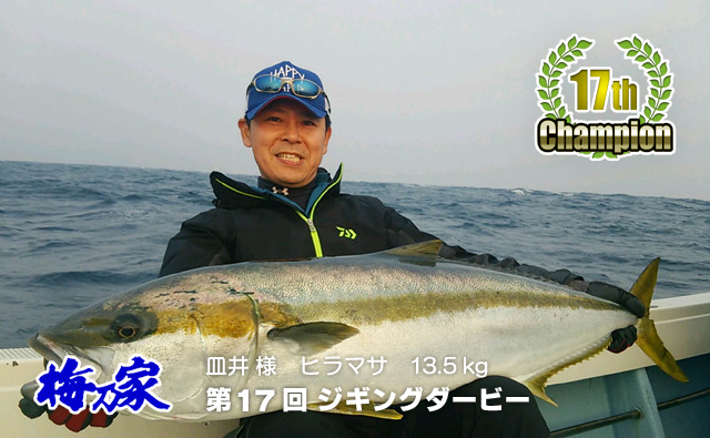 4月1日より5月31日まで開催されていた梅乃家ジギングダービーにおいて4月5日にヒラマサ13.5kgを釣り上げた大阪府在住の皿井さんが見事頂点となりました! 優勝した皿井さんには梅乃家より「1日チャーター無料乗船券」が進呈されました! 本当におめでとうございます!! |