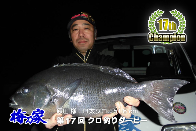 2019年1月1日より3月31日まで開催されていた第17回梅乃家クロ釣りダービーにおいて対馬市の原田さんが口太クロ51.6cmを釣り上げ見事栄冠を手にしました! 優勝した原田さんには「 シマノ プロテック1.5-53 」が進呈されました! 優勝おめでとうございます!! |
