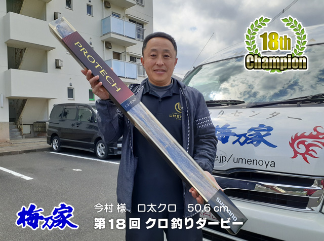 2020年1月1日から3月31日まで開催されておりました第18回梅乃家クロ釣りダービーにおいて、対馬市の今村さんが口太クロ50.6センチを釣り上げ見事栄冠を手にしました! 優勝した今村さんには『 シマノ プロテック 1.2号-530 』が贈られました! 優勝おめでとうございます! |