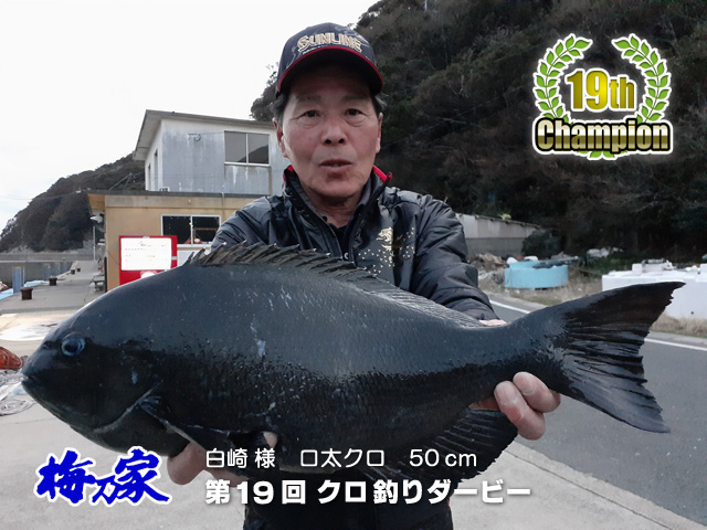 2021年1月1日より開催されていた、第19回梅乃家クロ釣りダービーにおいてこのほど優勝者が決定致しました! 去る2月24日に口太クロ50センチを釣り上げた対馬市の白崎さんが見事栄冠に! |
