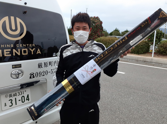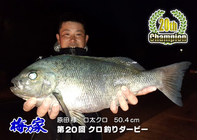 2022年1月1日より開催されていた第20回梅乃家クロ釣りダービーにおいてこのほど優勝者が決定致しました! 去る3月14日に口太クロ50.4センチを釣り上げた対馬市の原田さんが見事栄冠に! |