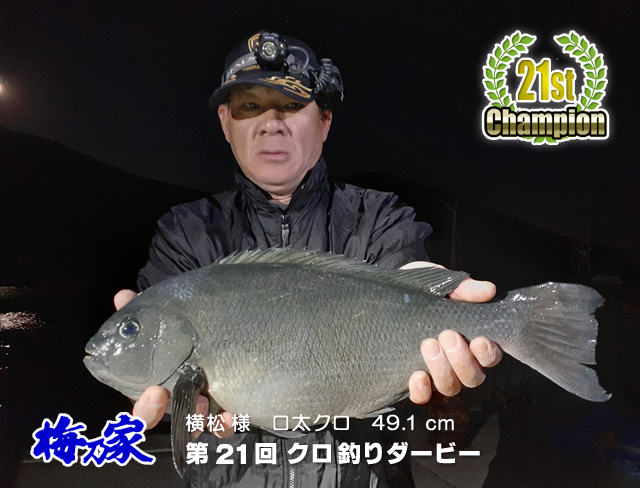 令和5年1月より開催されていた第21回梅乃家クロ釣りダービーにおいて、対馬市の横松さんが2月5日に口太クロ49.1センチを釣り上げ見事栄冠に輝きました! |