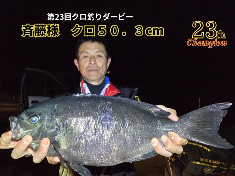 令和7年1月1日より3月31日まで開催されておりました第23回梅乃家クロ釣りダービーにおいて優勝者が決定致しました! 見事栄冠を手にしたのは対馬市在住の斉藤さん!口太クロ50.3センチを釣り上げました!優勝おめでとうございます!! |