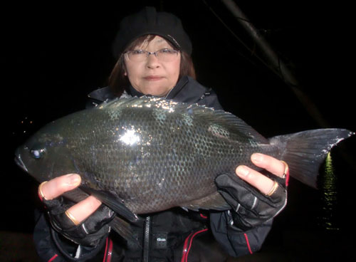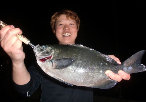 ![]() | 2位には2大会連続入賞の女性アングラー福井さん 口太クロ41.4cmを釣り上げました!2位の福井さんには賞品として「 特大ホットプレート 」が進呈されました。 |