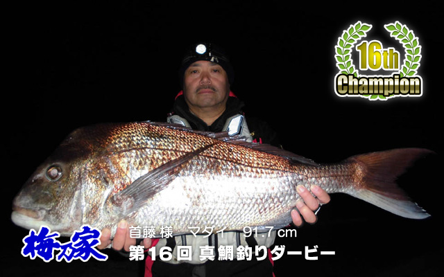 平成29年10月1日より12月31日まで開催されていた第16回梅乃家真鯛釣りダービーにおいてこのほど優勝者が決定致しました。 優勝したのは12月3日に真鯛91.7cmを釣り上げた福岡県の首藤さんに決定!! 首藤さんには、2018ダービー期間内無料乗船券が進呈されました。優勝おめでとうございます!! |