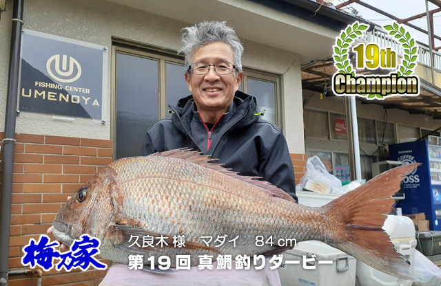 2020年10月1日から12月31日まで開催されておりました第19回梅乃家真鯛釣りダービーにおいて、福岡県からお越しの久良木さんが真鯛84センチを釣り上げ見事栄冠を手にしました! 優勝した久良木さんには『 次回ダービー期間内無料乗船券 』が贈られました! 優勝おめでとうございます! |