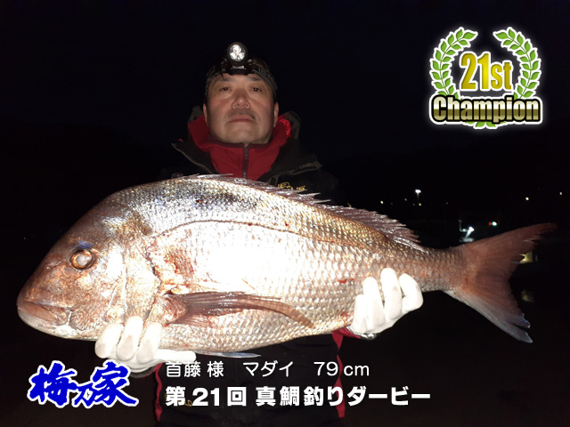 2022年10月1日より開催されておりました第21回梅乃家真鯛釣りダービーにおいて優勝者が決定しました! 栄冠に輝いたのは12月29日に真鯛79cmを釣り上げた福岡県からお越しの首藤さん! 優勝おめでとうございます!! |
