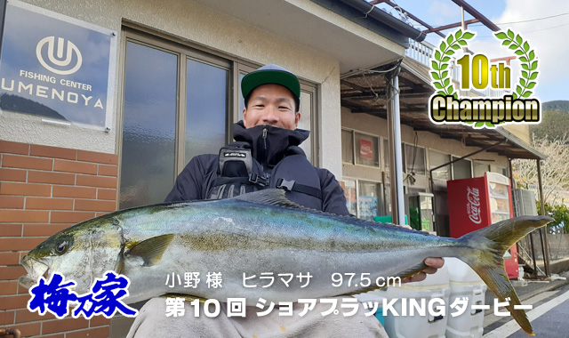 2021年10月1日より開催されておりました、第10回梅乃家ショアプラッKINGダービーにおいて優勝者が決定しました! 栄冠に輝いたのは12月5日にヒラマサ97.5cmを釣り上げた大阪府からお越しの小野さん! 優勝おめでとうございます!! |