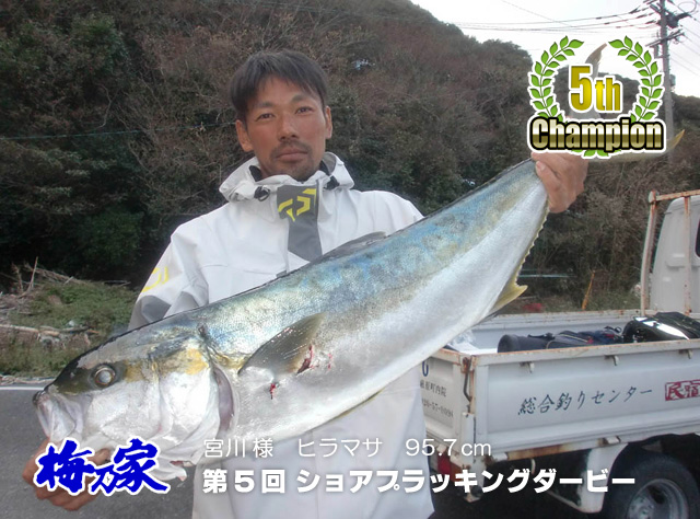 2016年10月1より開催されていた第5回梅乃家ショアプラッキングダービーにおいて優勝者が決定致しました! 優勝したのは10月15日にヒラマサ95.7cmを見事に釣り上げた兵庫県からお越しの宮川さん、優勝賞品として「次年度ダービー期間内無料乗船券」が進呈されました! 本当におめでとうございます!! |
