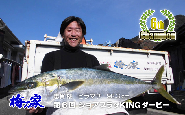 平成29年10月1日より12月31日まで開催されていた第6回梅乃家ショアプラッKingダービーにおいてこのほど優勝者が決定致しました。 優勝したのは12月22日にヒラマサ98.3cmを釣り上げた福岡県の志賀さんに決定!! 志賀さんには、2018ダービー期間内無料乗船券が進呈されました。優勝おめでとうございます!! |