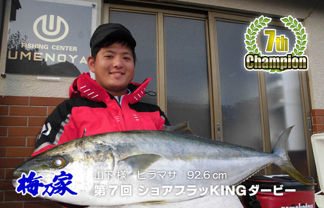 2018年10月1日から12月31日まで開催されていた第7回梅乃家ショアプラッKINGダービーにおいて10月21日に、92.6cmの見事なヒラマサを釣り上げた鹿児島県の山下さんが見事栄冠に輝きました! 優勝した山下さんには賞品として「次回ダービー期間内無料乗船券」が進呈されました! 優勝おめでとうございます! |