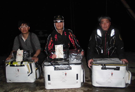 | また3月7日は梅乃家の智明船長の誕生日という事で逆バースデープレゼントをしました。 抽選の結果、優勝した山営さん、準優勝の平井さんにそれぞれ「賞金」と「サンラインBOX」が贈られました! 上位入賞者の皆さんおめでとうございます!! |