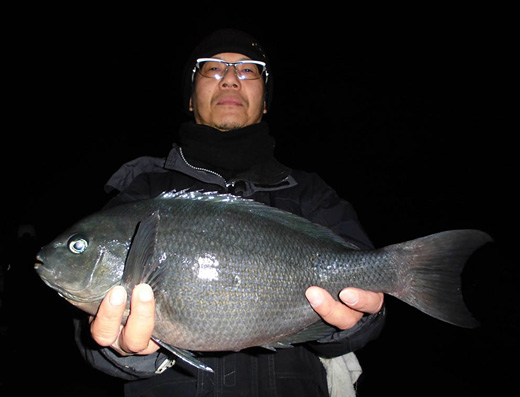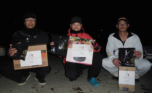 | 1月6日、第49回チーム梅乃家のクロ釣り大会が開催されました! ● 栄えある栄冠を手にしたのは対馬市の徳山さん 口太クロ42.6cmを釣り上げ優勝! 徳山さんには賞品として「ホットプレート」と「梅乃家オリジナルパーカー」が進呈されました! |