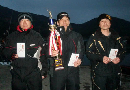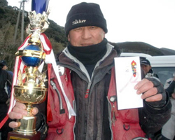 栄えある栄冠を手にしたのは小畑さん、クロ2匹長寸77.1cmを釣り上げ、優勝しました!優勝した小畑さんには「優勝トロフィーと賞金」が贈られました。おめでとうございます。 |