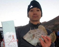 5位には2匹長寸71.3cmを釣り上げた坂本さん!坂本さんには「理容専門ドライヤー」が贈られました。おめでとうございます。 |